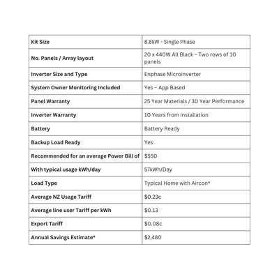 This 8.8kW solar power system is ideal for larger New Zealand homes with higher daily electricity consumption, offering outstanding energy efficiency, design appeal, and long-term flexibility. It includes 20 x 440W All Black solar panels, arranged in two rows of ten, and mounted with sleek black racking to create a low-profile, architecturally clean finish that complements any modern roof.